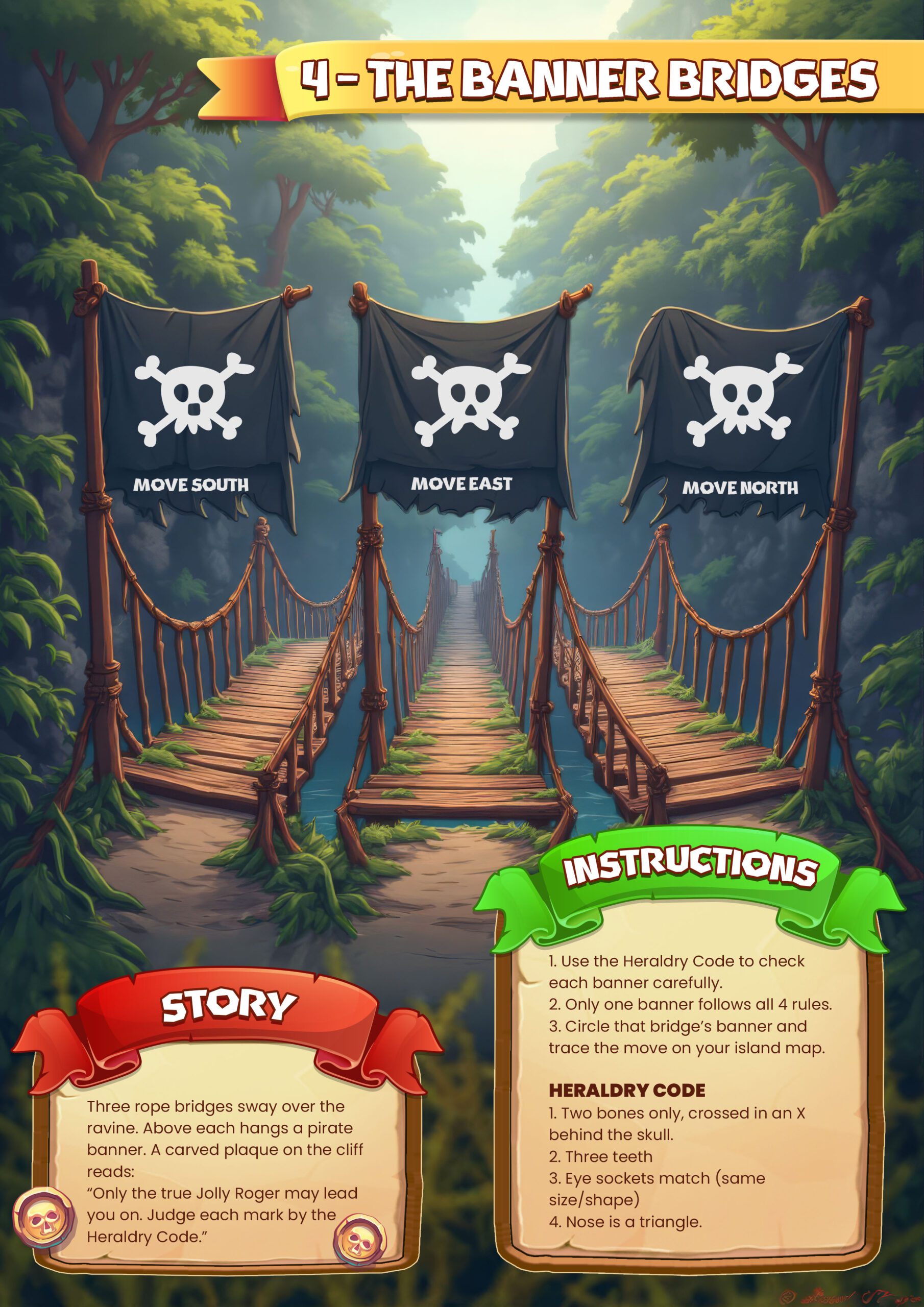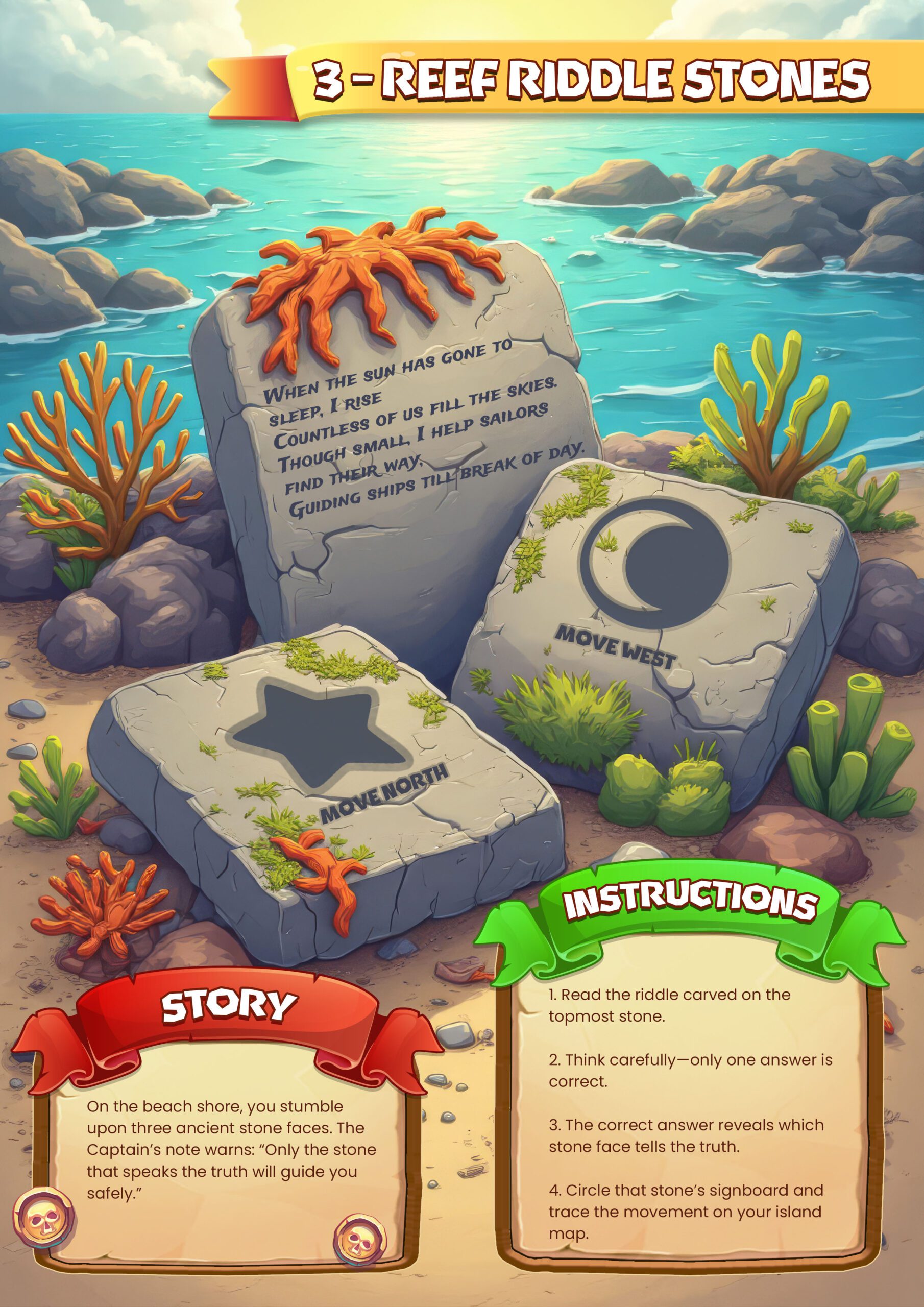 Each puzzle page reveals the captain’s next move — north, east, south, or west — guiding your crew step by step across the island map. Along the way, kids will solve riddles, ciphers, mazes, and logic puzzles, discovering clues hidden among palm trees, shipwrecks, and mysterious ruins.